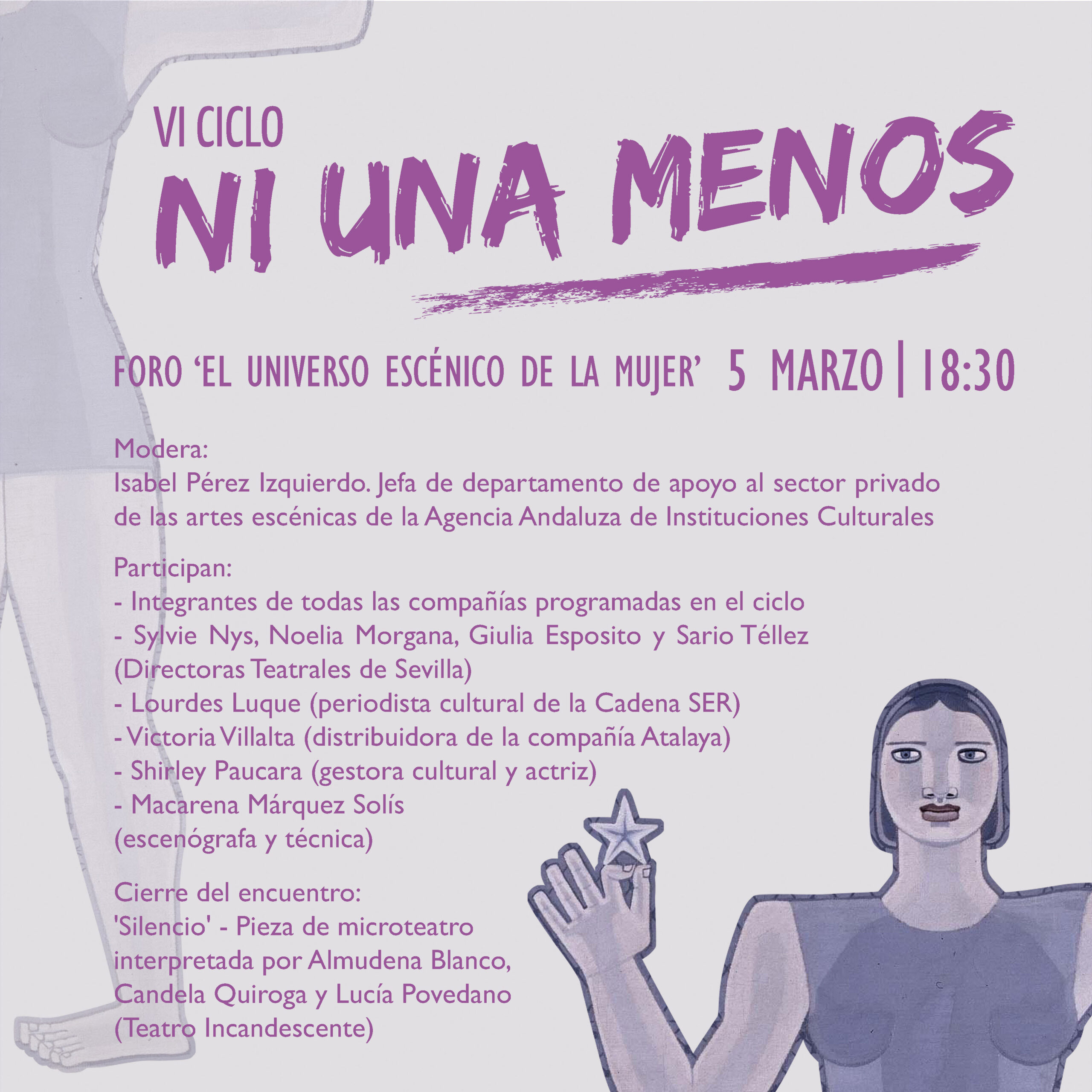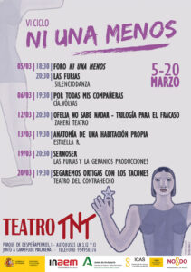 Esta charla se realiza en el marco del ciclo Ni una menos, que tendrá sobre todo, una reflexión del discurso escénico de diferentes mujeres creadoras en escena. Puestas de diversas compañías de España, estarán los sábados y domingos desde el 5 al 20 de marzo. No dejen de ir a este estimulante encuentro de cuestionamientos sobre el universo femenino, que atañe no solo a las mujeres. Invitados están todos y todas.
