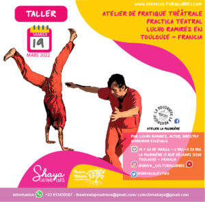 – Un atelier de pratique théâtrale les 19 et 20 mars de 11h à 13h30 (5 heures au total) pour un tarif de 60 euros par personne pour les deux jours. Pour les personnes intéressées, une inscription préalable est requise à l’adresse électronique suivante :