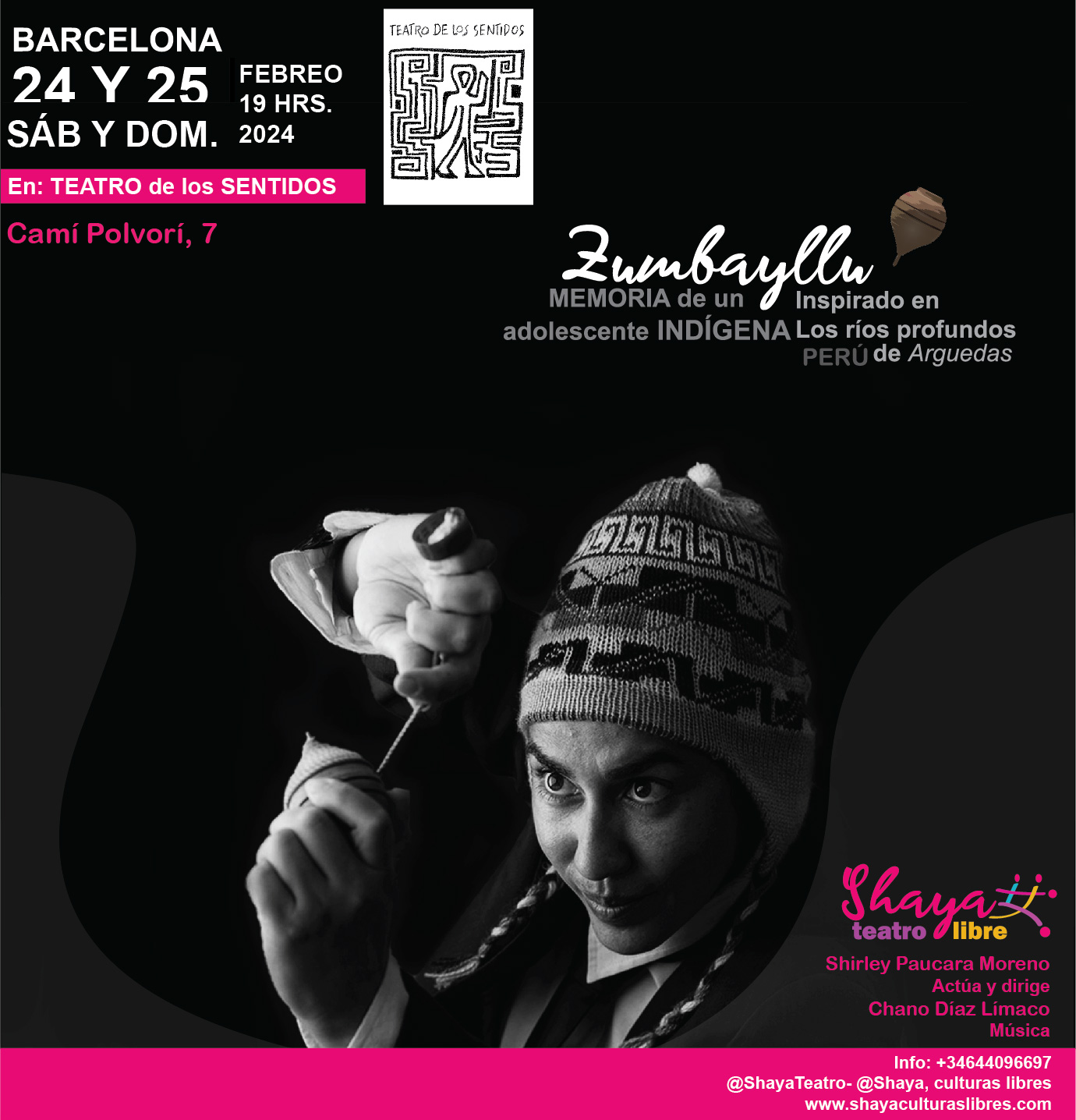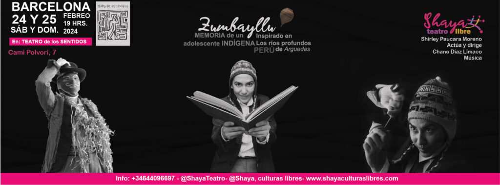 La cía. peruana – española Shaya Teatro, presenta Zumbayllu, memoria de un adolescente indígena, este viernes 24 y sábado 25 de febrero a las 19 hrs, en Barcelona, en el Teatro de los Sentidos, Cami Polvorí 7. La obra está inspirada en la novela Los ríos profundos del destacado escritor peruano José María Arguedas.