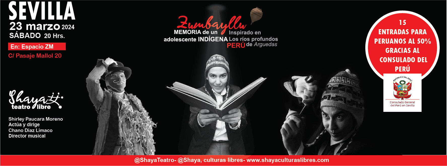 La cía. peruana – española Shaya Teatro, presenta Zumbayllu, memoria de un adolescente indígena, este sábado 23 de marzo a las 20 hrs, en el Espacio ZM, Calle Pasaje Mallol 20. La obra está inspirada en la novela Los ríos profundos del destacado escritor peruano José María Arguedas, las entradas pueden adquirirlas Aquí. La comunidad de peruanos tendrá entradas especiales gracias al Consulado del Perú en Sevilla.